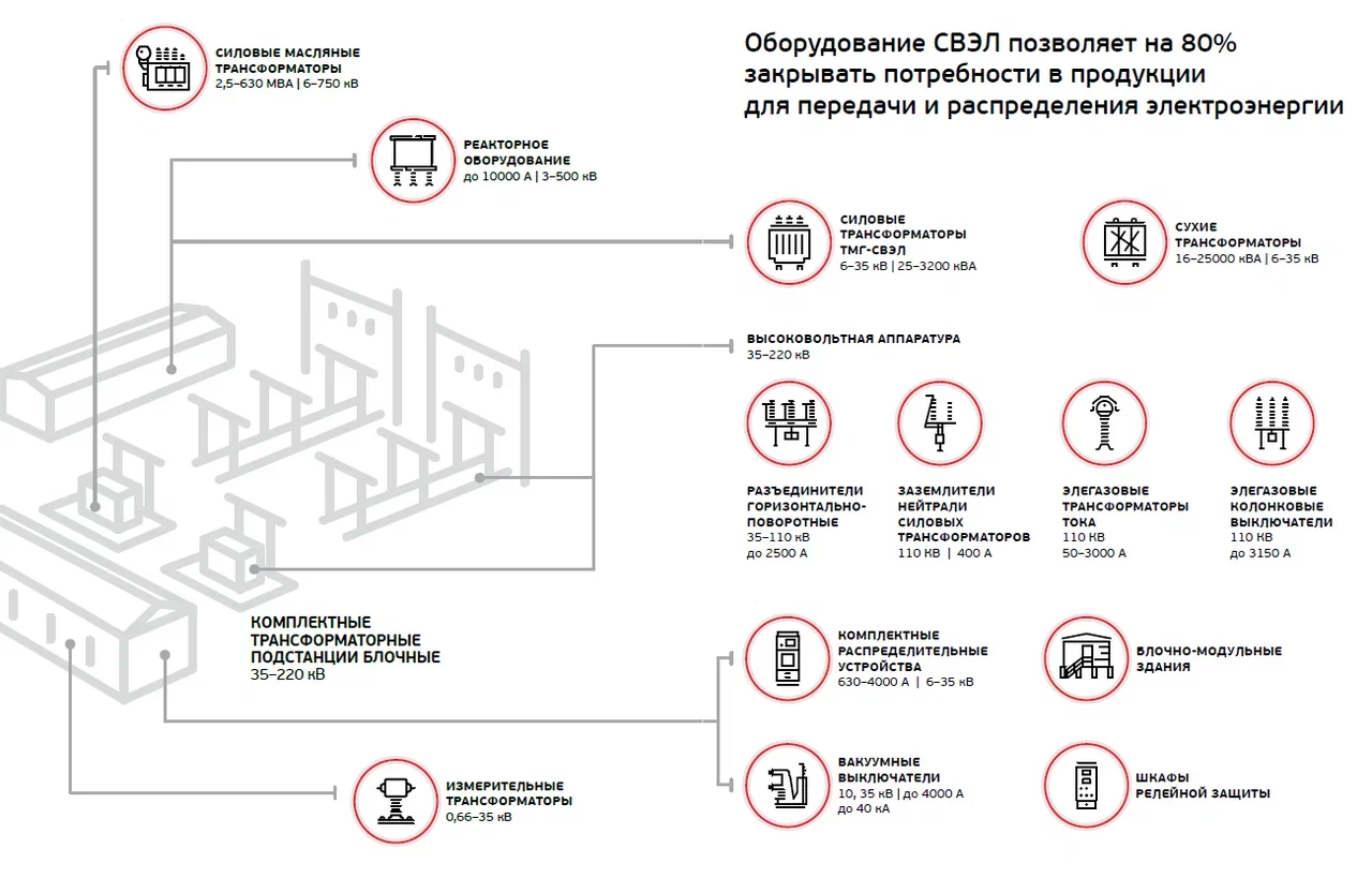 Продукция на классы напряжения 35, 110 и 220 кВ, разработанная инженерами «группы «СВЭЛ» (код ОКП 34 1200), воплощает современные модульно-блочные принципы компоновки. Проектные решения полностью соответствуют действующим «Правилам Устройства Электроустановок» (ПУЭ), а также техническим требованиям и рекомендациям ОАО «ФСК ЕЭС».