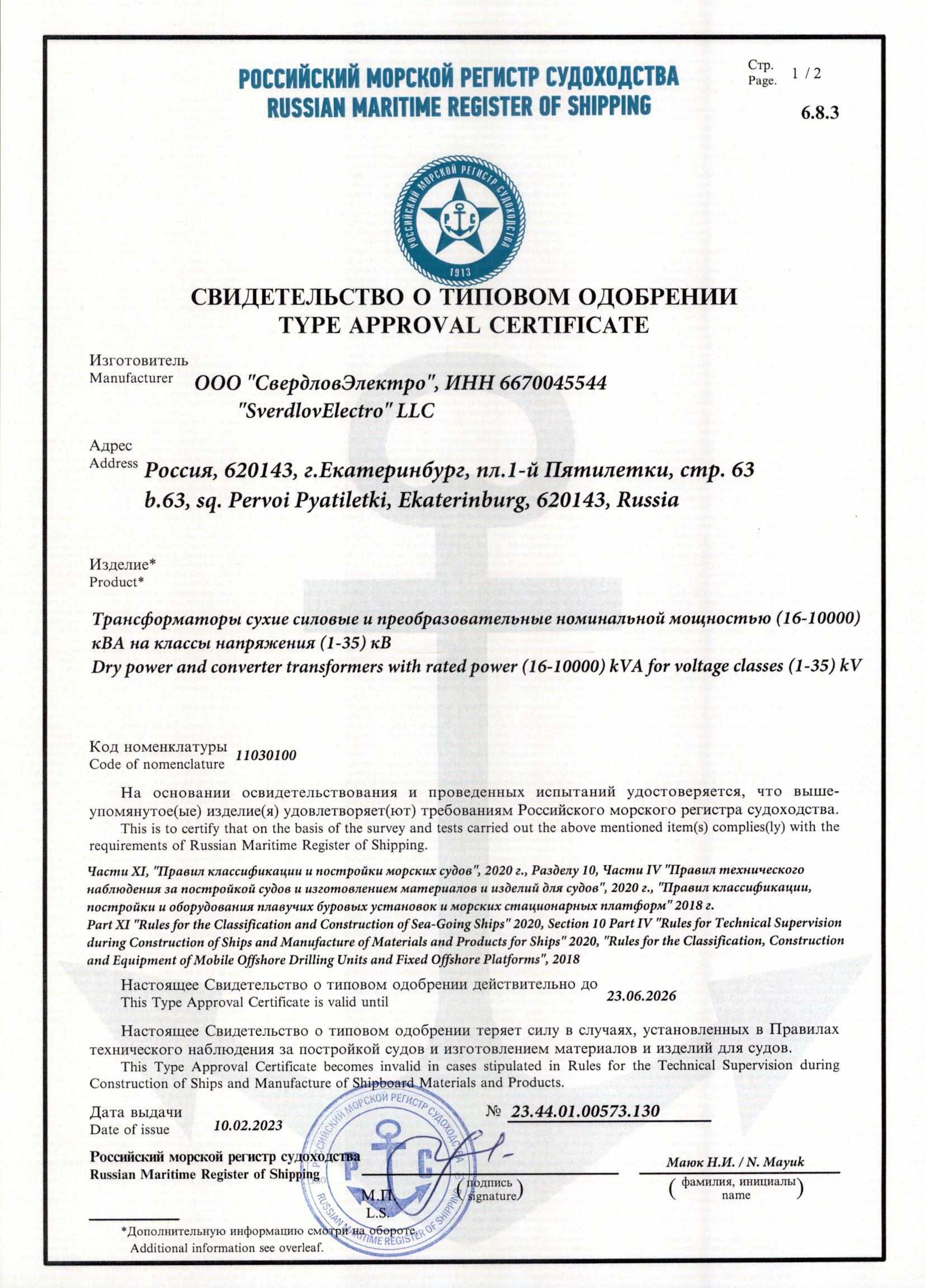 Группа СВЭЛ подтвердила соответствие сухих трансформаторов Российскому морскому регистру судоходства